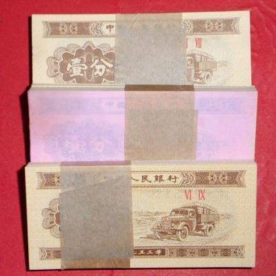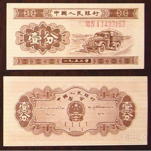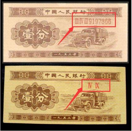 1953年一纸分币分两类,第一类是五十年代原版的一纸分币,票面为红色的,上边是一幅大卡车的图像,左边是繁体字写的一分,下边是表写着一九五三年,而重中之重是右边卡车的上方除了三位罗马冠字外标有阿拉伯数字,这种纸币就是五三年一分纸币的原版,存世量非常之少屈指可数,第二类是80年代初为了缓解铝分币供应不足的现象,而采用50年代印版重新印刷的再版一纸分币。为了与原版相区别,正面只印罗马冠字而无数字编码。这种纸币目前还很常见,收藏价值不大。