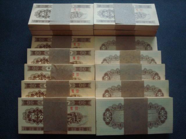 纸分币在新中国货币史上,是绝无仅有的,简单的印制设计,从有号到无号,从建国初期到停止发行的90年代,纸分币记载着我国历史的变迁,记载着新中国的变化,它是历史的见证,是我们经济发展的见证。第二套纸分币虽然退出了流通市场,但在收藏市场确大显身手,成为了收藏市场上的香饽饽,全套面值8分钱,市场价格高达2500元,升值3万倍。