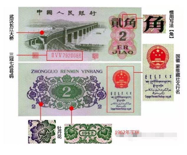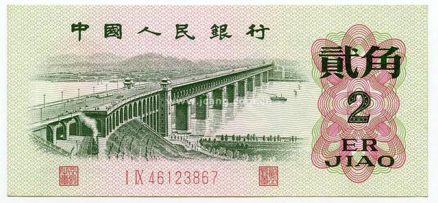 第三套人民币二角券(俗称长江大桥),1962 发行时间1964年,2000年停止流通。第三套人民币2角因为“贰”的写法与现在字典上的写法不一样,“角”的写法更象是笔误,就有人在这两点上面做文章,说是错币而进行炒作,当然 这都是后来才发生的故事。