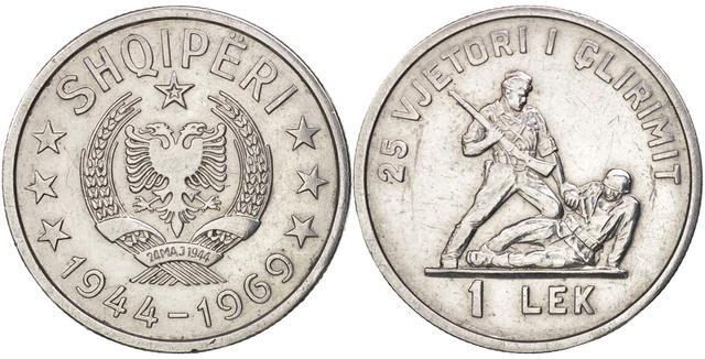 因为和中国有着反苏修这个相同的立场,阿尔巴尼亚被誉为:欧洲的一盏伟大的社会主义的明灯。上图为1969年,阿尔巴尼亚解放25周年1列克纪念币。