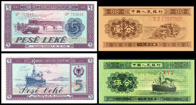 同样相似的还有阿尔巴尼亚的5列克,正面的陆运汽车,背面的海运轮船,和咱们第二套人民币的1分、5分纸币如出一辙。特别需要指出的是图案中的卡车,就是我们熟悉的解放牌大卡车,这个是我们长春一汽当时的拳头产品,我国给阿尔巴尼亚的大量援助中就包含这种卡车,在当时阿尔巴尼亚的公路上,跑的大部分都是解放大卡车。