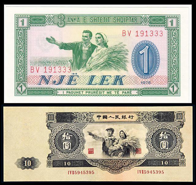被誉为2.5套人民币的中国援助代印阿尔巴尼亚纸币,上面是阿尔巴尼亚1列克,下面是我国的第二套人民币十元,俗称大黑拾,主要的人物图案“工人和农民”极其相似,都是工人右手指着前方,农民怀抱着丰收的麦穗,就连服装打扮都非常相似,只是换了个外国面孔。