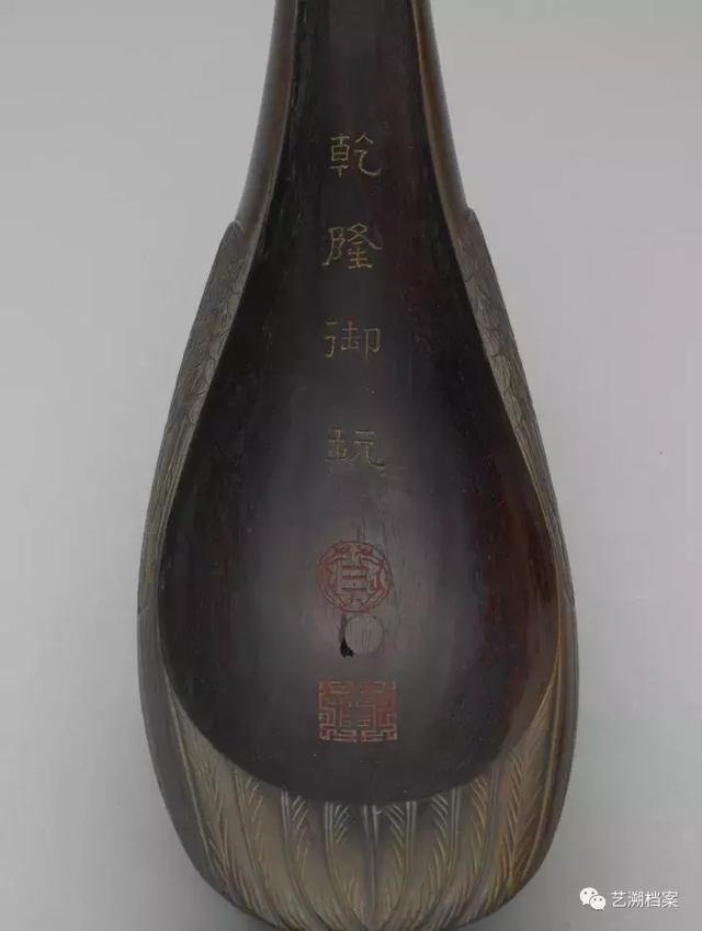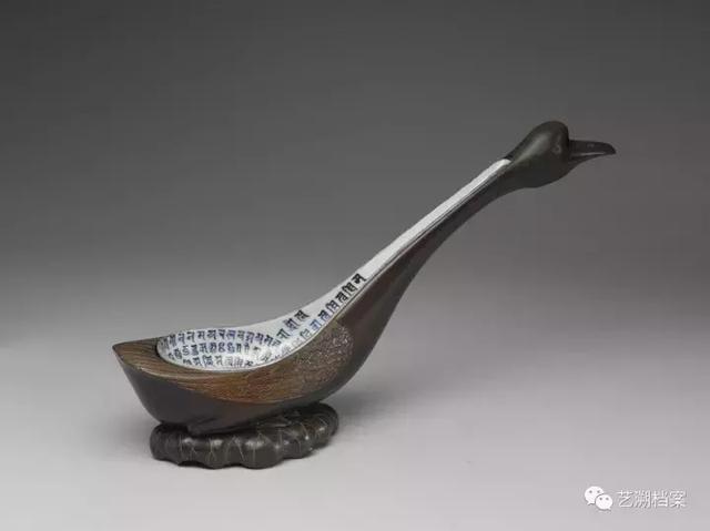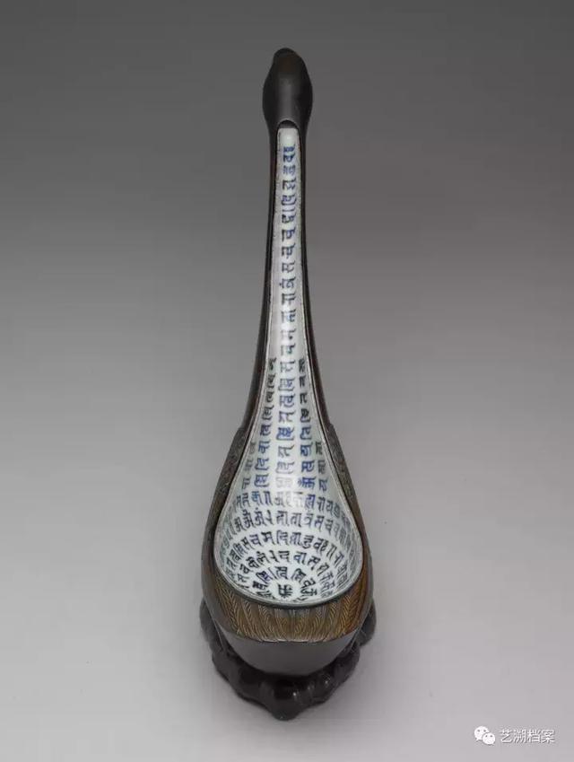 种子字是诸佛菩萨的象征。景德镇珠山遗址曾出土一件同形大勺,这种带有种子字及朵莲的瓷质大勺,很可能是皇室的宗教用器,而器外散点式分布的朵莲,也和永乐时期佛经上的装饰十分相似。乾隆皇帝为了这件大勺特别配置了一个鹅形紫檀木座,托座内并刻“乾隆御玩”一行四字楷书以及“≡”及“隆”两枚印文,显示乾隆皇对其的珍视。