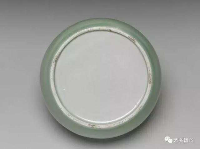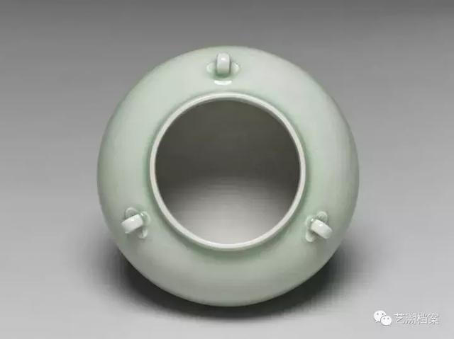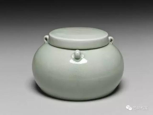 翠青釉是永乐时期开始创烧的颜色釉,因颜色类似翠竹之青色而得名。这件盖罐颈部短而微敛,器身扁圆,肩部有三个四瓣花托饰的环形系耳,圈足浅,带平顶直口盖扣于环形系耳之内,是永乐时期独有的罐式。罐里、圈足内及盖内施青白釉,其余施翠青釉。翠青釉以氧化铁为呈色剂,釉面的玻璃质感强,釉内满布气泡状如鱼子,色调淡雅清新,传世品并不多见。