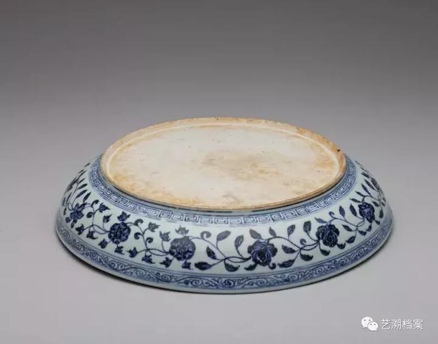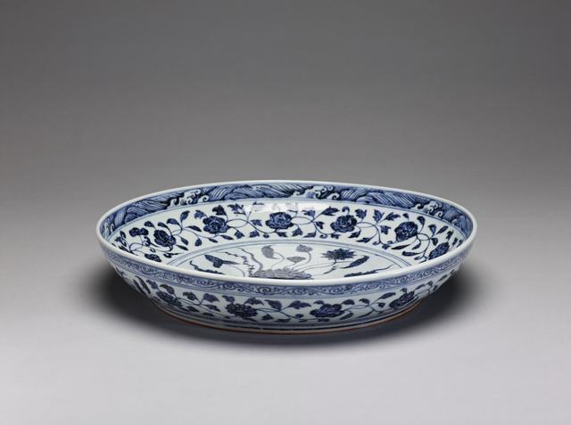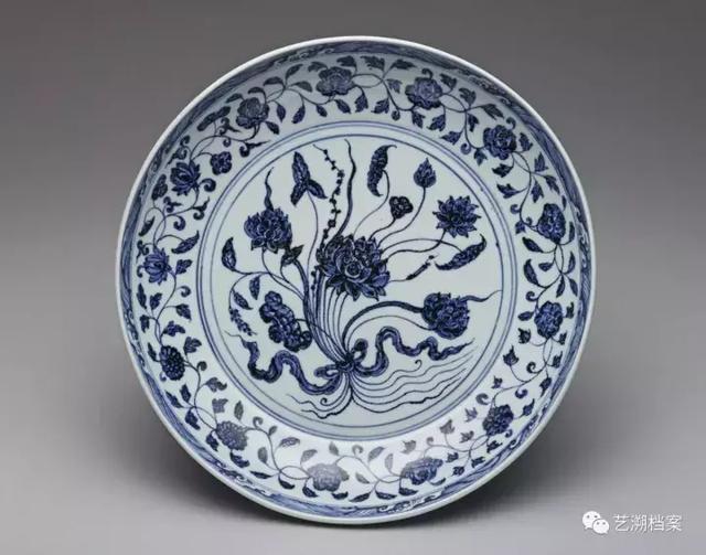 盘子弧壁,矮圈足。器底露胎,全器以青花为饰。口沿下是海水波涛纹,内壁有莲花、石榴、菊花等各式花朵共十三朵,外壁口沿下绘卷草纹,壁面画缠枝花卉十四朵,近圈足处有回纹一周。盘心主纹饰是莲花、慈菇等扎成的花束。因为外交往来以及贸易交换等因素,土耳其的托普卡普宫殿博物馆以及伊朗的阿德卑尔神庙收藏有大量的十五世纪初期青花瓷器,类似这件作品的青花一把莲盘,在两大收藏中也都可以见到。在阿德卑尔神庙收藏一件同类型盘子,器底有“青花磬口花盘一样”及与价格相关记载的墨书,可以让人遥想其流通海外的情景。