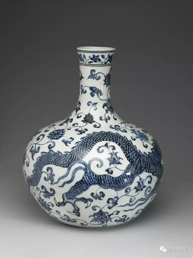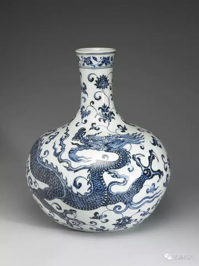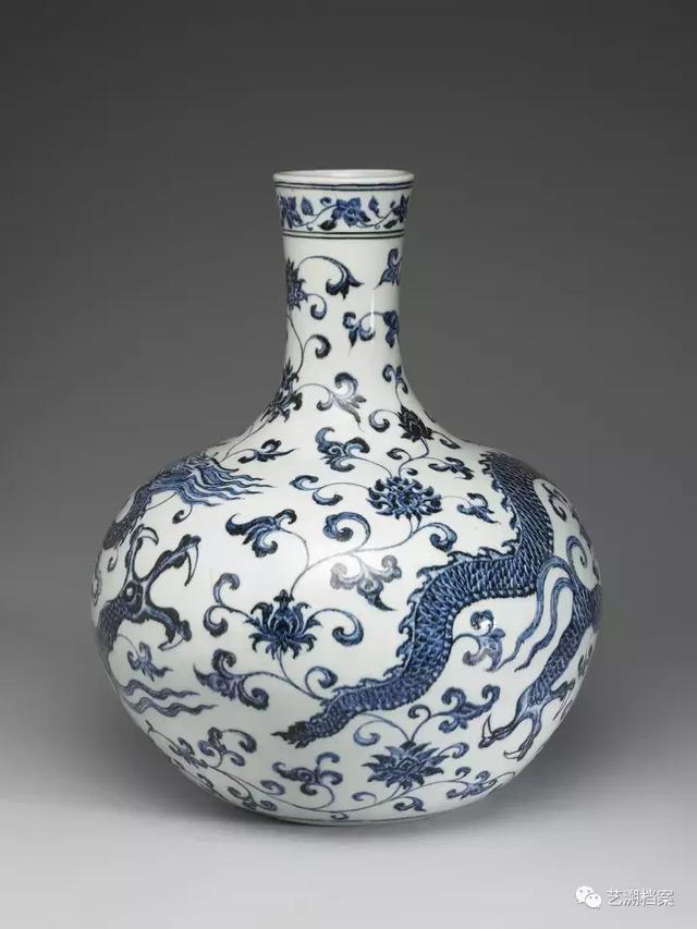 青花天球瓶硕大浑厚,器身环绕威武雄猛的穿莲三爪行龙,整体气势堂皇庄重,是台北故宫博物院所藏永乐青花瓷器中的名品。天球瓶的胎体致密,釉面莹润。口略外侈、直颈、圆鼓腹、平底微凹、无圈足。通体绘饰一回首张望的穿莲三爪行龙,张口吐舌,露牙双目圆睁,阔步张爪,龙身满画鳞甲,雄武矫健。瓶颈及背景空隙处则绘转枝莲花纹饰,青花艳丽浓重,绘画线条流畅,展现此时制瓷的高超工艺。