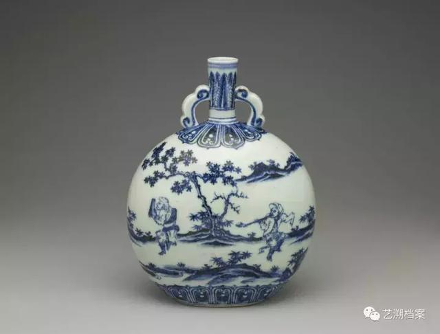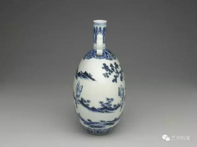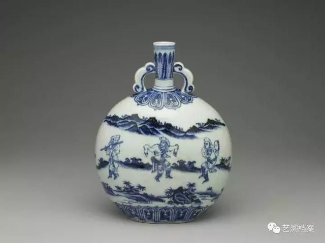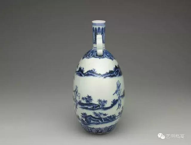 如意耳扁壶的器形受到中西亚陶器及玻璃器的影响。小口,细颈,腹部扁圆,平底无足,颈部两侧各有一弓形耳连接颈部和肩部。全器以青花为饰,颈上画青花蕉叶纹。腹部两面画山水,肩部及近底处各画仰覆莲瓣纹一周。腹部中央如同一小景,前景有坡石水脚,中景为树石。扁壶一面有三人,另一面有二人,共有乐舞人物五名于远山近景间。人物的脸容和服饰呈现异族面貌。人物的姿态与组合和十四世纪伊斯兰祈求干涸泉水再度流动的画作相当近似。以人物作为装饰主题的如意耳扁壶存世目前所知仅有二件,一件典藏于本院,另一件收藏于土耳其伊斯坦堡的托普卡比宫博物馆,十分可贵。