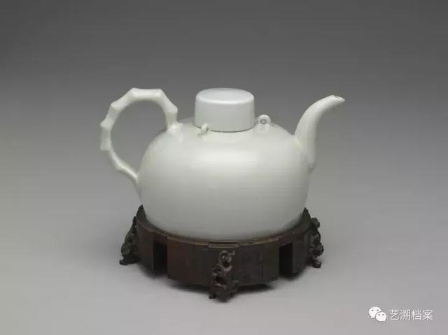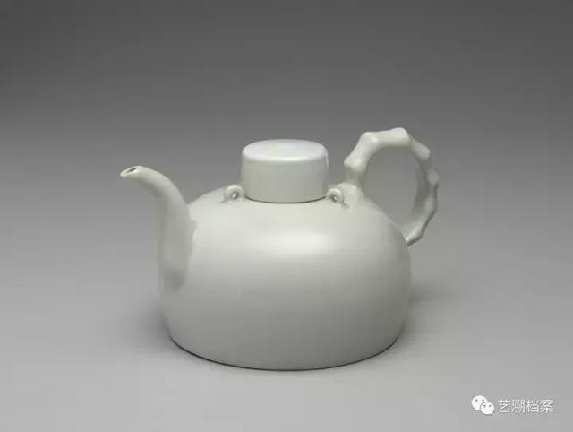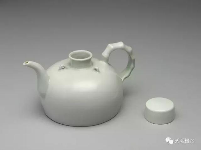 单把壶的壶身呈半球形,小口、短直颈、圆肩、器腹略内敛、平底、浅凹足。器肩上有三个环形系钮,器身一侧带曲流,另一侧带竹节把手,并有一平顶直璧原形盖罩住口颈。全器除足底露胎外,均施以白釉。全器光素无纹,釉色洁白莹润。相同器形之瓷壶存世不多,本院另藏有一件器形相同,器身饰以凤凰一对的青花三系竹节把壶,有学者推测两者皆为明初宫庭用茶器。广东台山南宋沈船中,曾出水有类似造型的锡壶,也有学者据以推测其为穆斯林使用的汤瓶。
