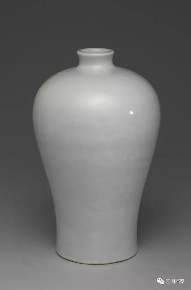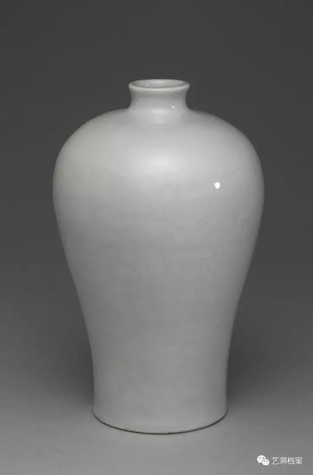 甜白釉瓷是永乐时期宫中主要用瓷。这件永乐白瓷梅瓶胎质洁白细致,釉质均匀盈润,圆口略侈,短颈丰肩,敛腹下收,平底,浅圈足。全器以细线刻划纹饰,瓶肩有转枝叶纹一周,间饰弦纹二道,腹部主纹刻划或绽放或含苞之缠枝莲花,底边上下饰有弦纹二道, 其间刻划折枝莲花六朵。根据1989 年景德镇珠山明代御窑厂遗址的发掘报告,永乐前期地层中的甜白釉瓷器占所有出土物的98% 以上。
