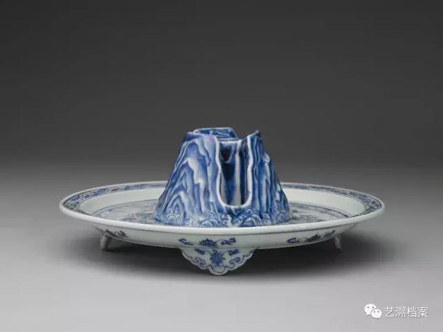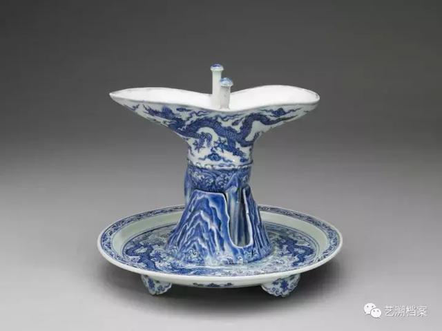 青花爵杯搭配山形托盘首见于明代永乐时期。爵杯仿青铜爵器形,前有椭圆流,后带尖形尾,左右有双柱立于口沿,器腹下承三足。托盘折沿、平底,底有四如意形足,盘中央突起一座三山形支柱,三山之间略凹并有三孔隙,供瓷爵的腹部及三足歇放,所以也称“歇爵山盘”。瓷爵外壁两侧各画一条五爪云龙,其下画海水江崖纹,三足各饰如意云纹及双线,器底有涩胎一圈,中央施釉并画莲花一朵,器内纯白无纹饰。盘中心除了三山形凸起外,四周绘饰双龙纹以及海水波涛纹,口唇上画勾云卷草纹、盘外画折枝番莲花二层,四足各有如意云及番莲一朵,盘底中心露出致密洁白胎体。相同的爵杯和托盘组合在景德镇负责烧造宫廷用器的珠山遗址曾有出土。