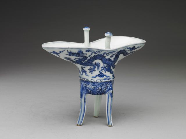 瓷爵的烧制始于元代。洪武元年(1368),明太祖朱元璋在谈论太庙祭器时,说:“共设酒尊三、金爵八、瓷爵十六于殿东西”,可以看出瓷爵在明初已是重要祭器。明英宗时,礼部尚书蒋守约也曾提到“大祀天地、社稷,旧制皆用瓷爵”,可以推想带有五爪云龙纹和海水江崖纹组合的瓷爵和爵盘,应该是永乐时期重要的家国重器。